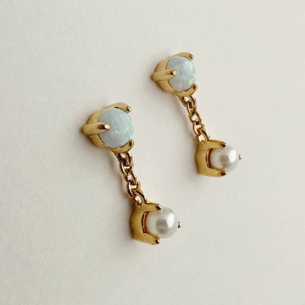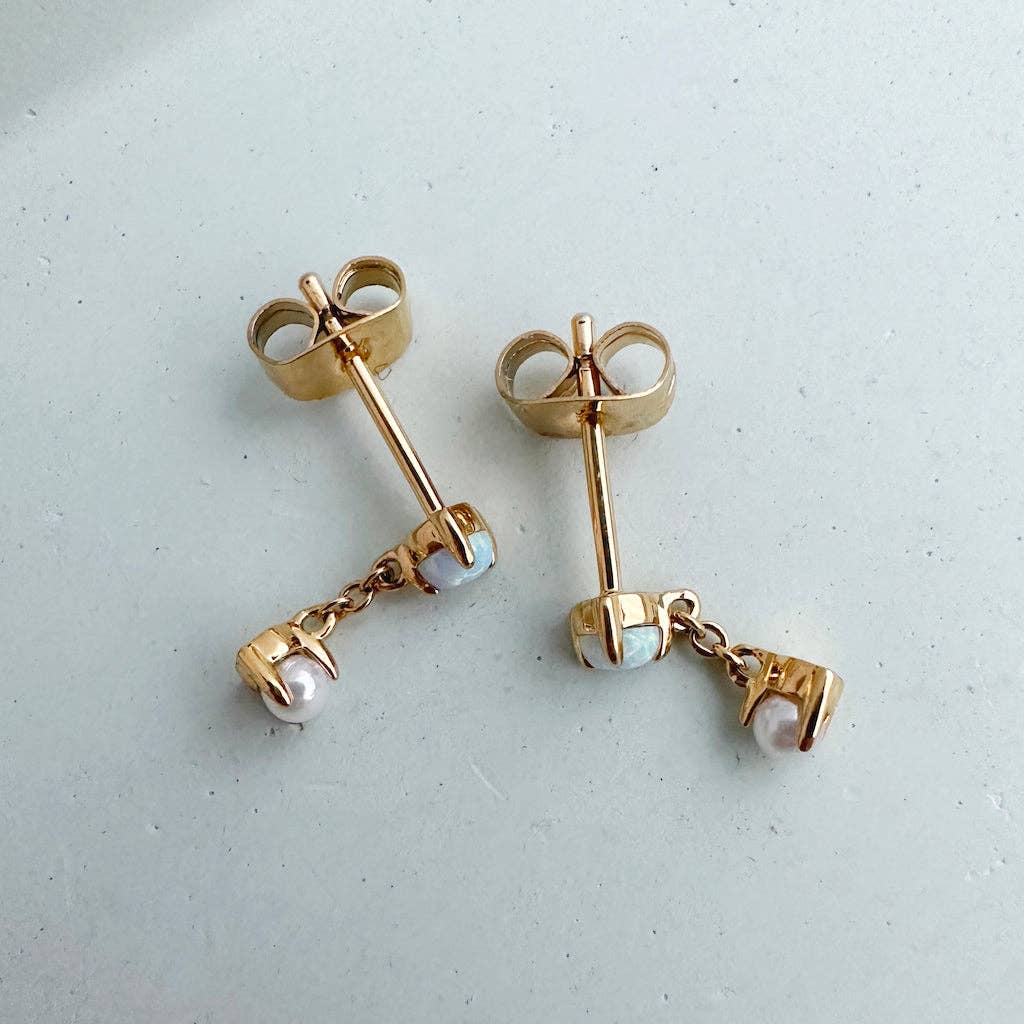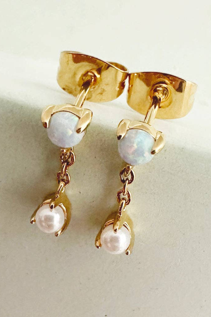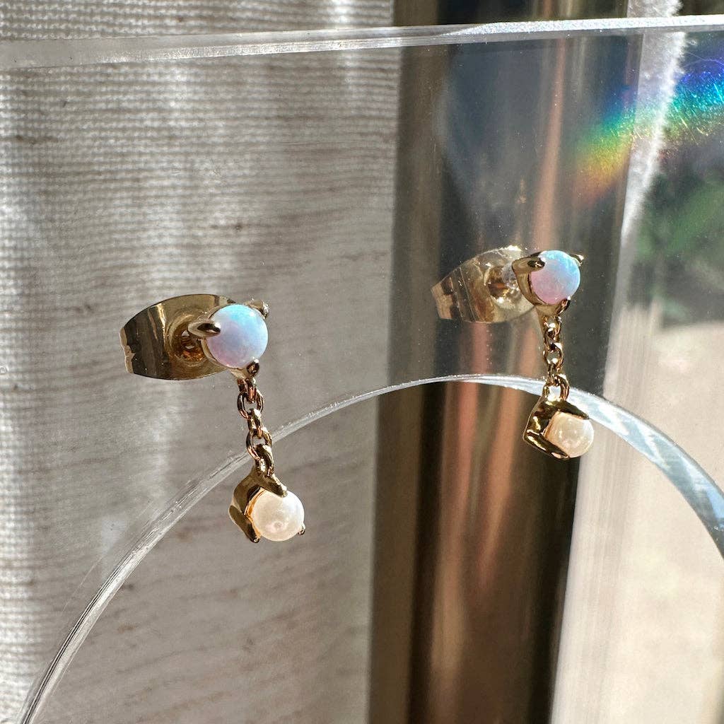 Delightfully dainty. These droplet chain studs feature a luminous pearl and glimmering moonstone attached to each other. Like our Earth and Moon, this intergalactic pairing is perfection... plus it'll add a celestial sparkle to your everyday style.
