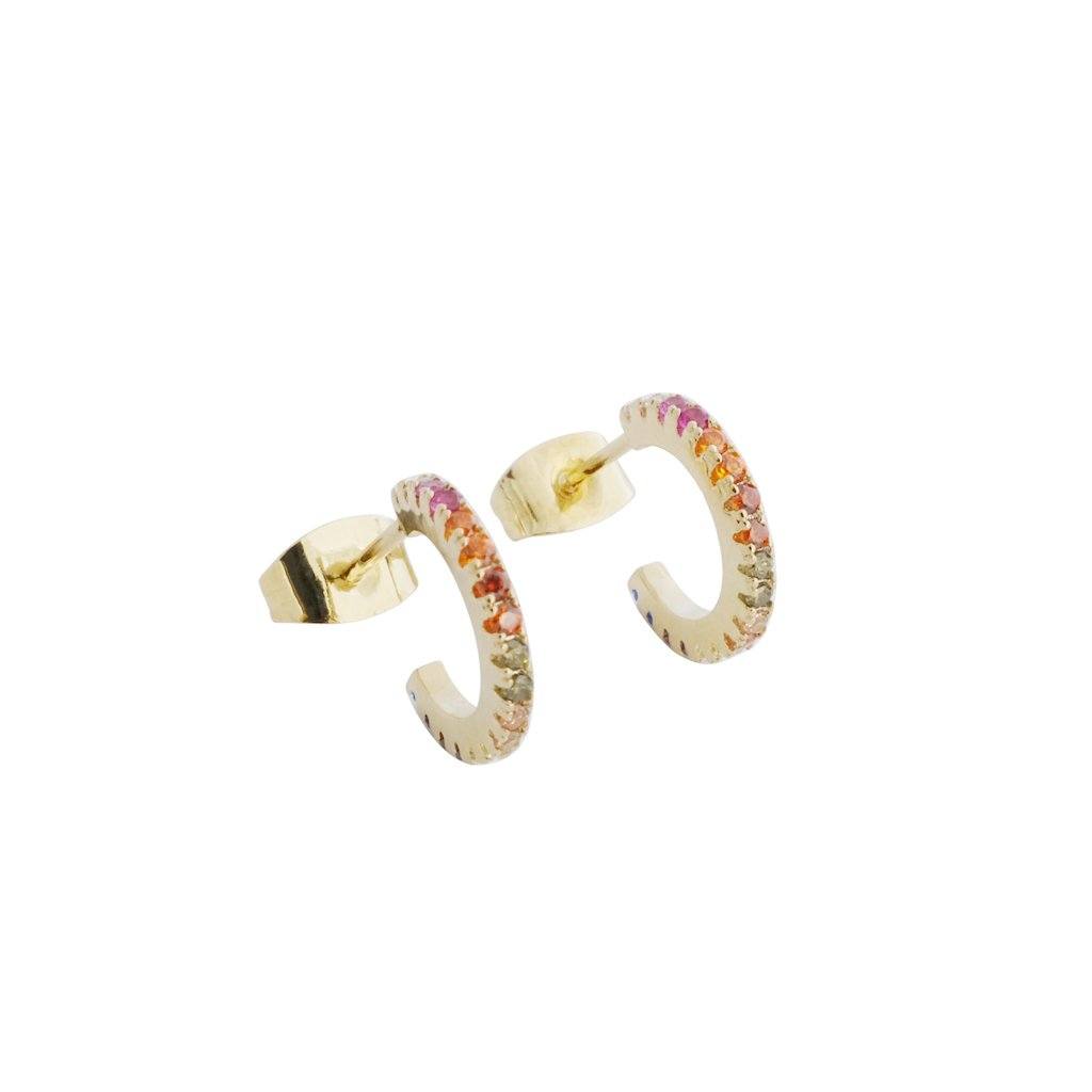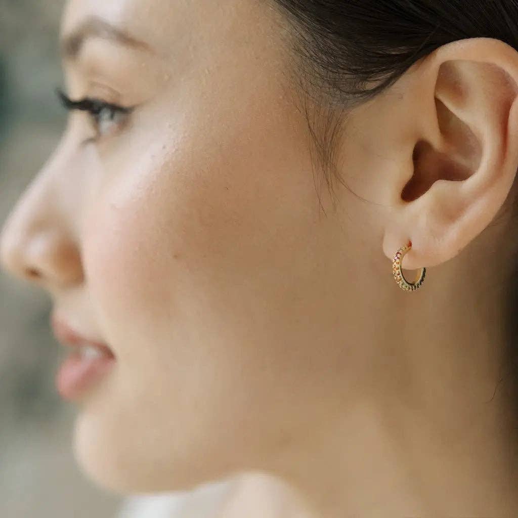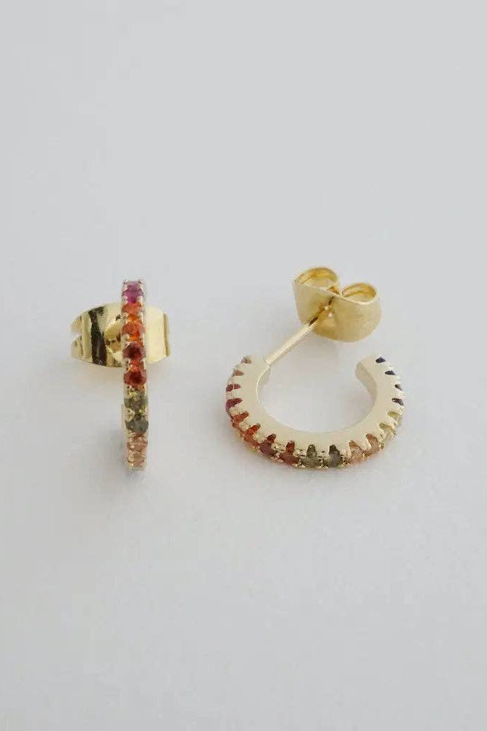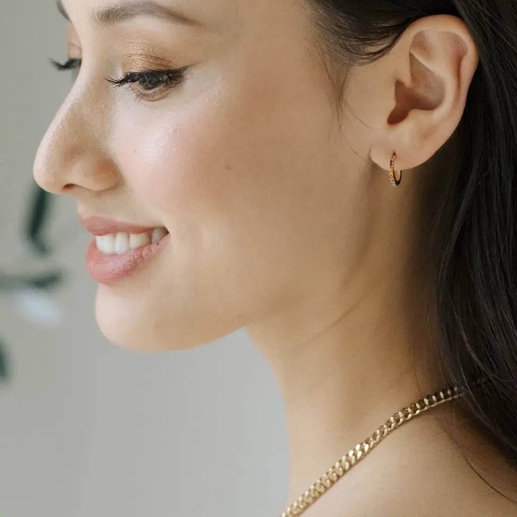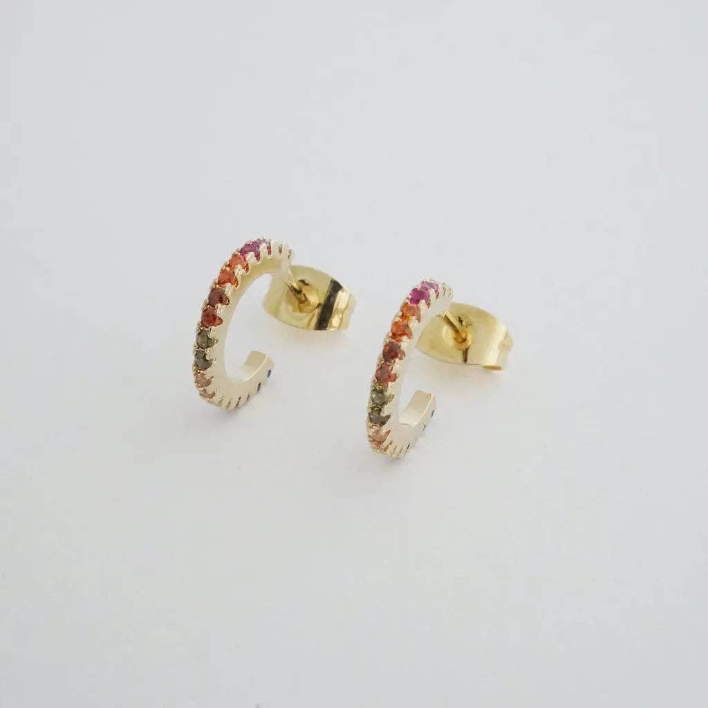 A pair of colorful crystal embedded hoops that perfectly hug your ear.Gorgeous worn solo or mixed alongside your favorite earrings. These measure 12 mm tall. Our materials make for an amazing, high quality, seamless, jewelry piece with longevity. Our earrings are plated with 18k gold, 18k rose gold, or rhodium and finished with a protective coating.