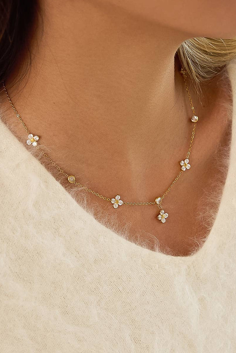18K Gold Non-Tarnish CZ Floral Chain Necklace