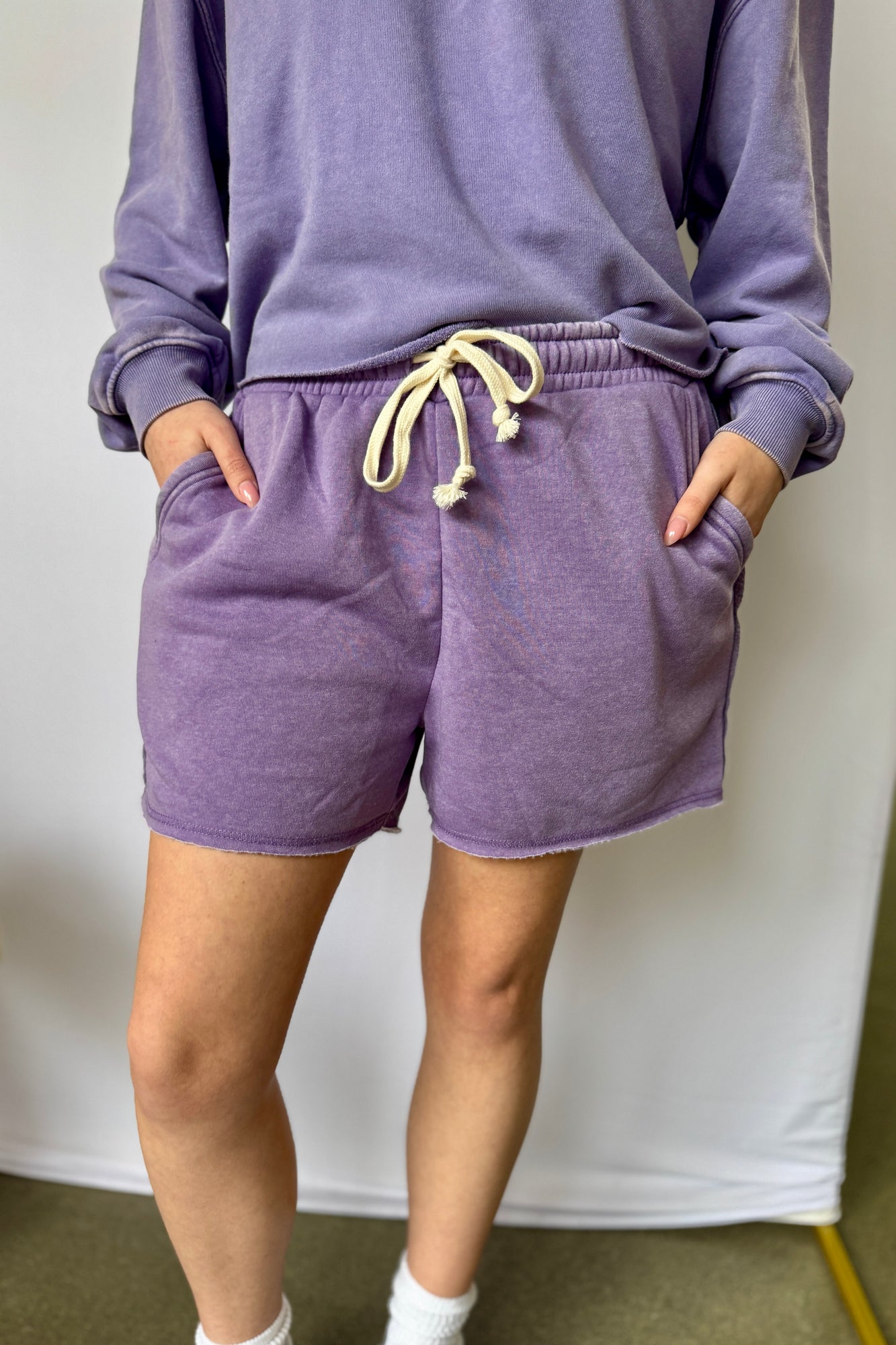 These shorts are crafted from soft burnout french terry and features a comfortable high-rise elastic waistband with a functional drawstring and deep side seam pockets. The cut is a relaxed, mid-thigh fit with exposed seams and a raw-edge hemline.