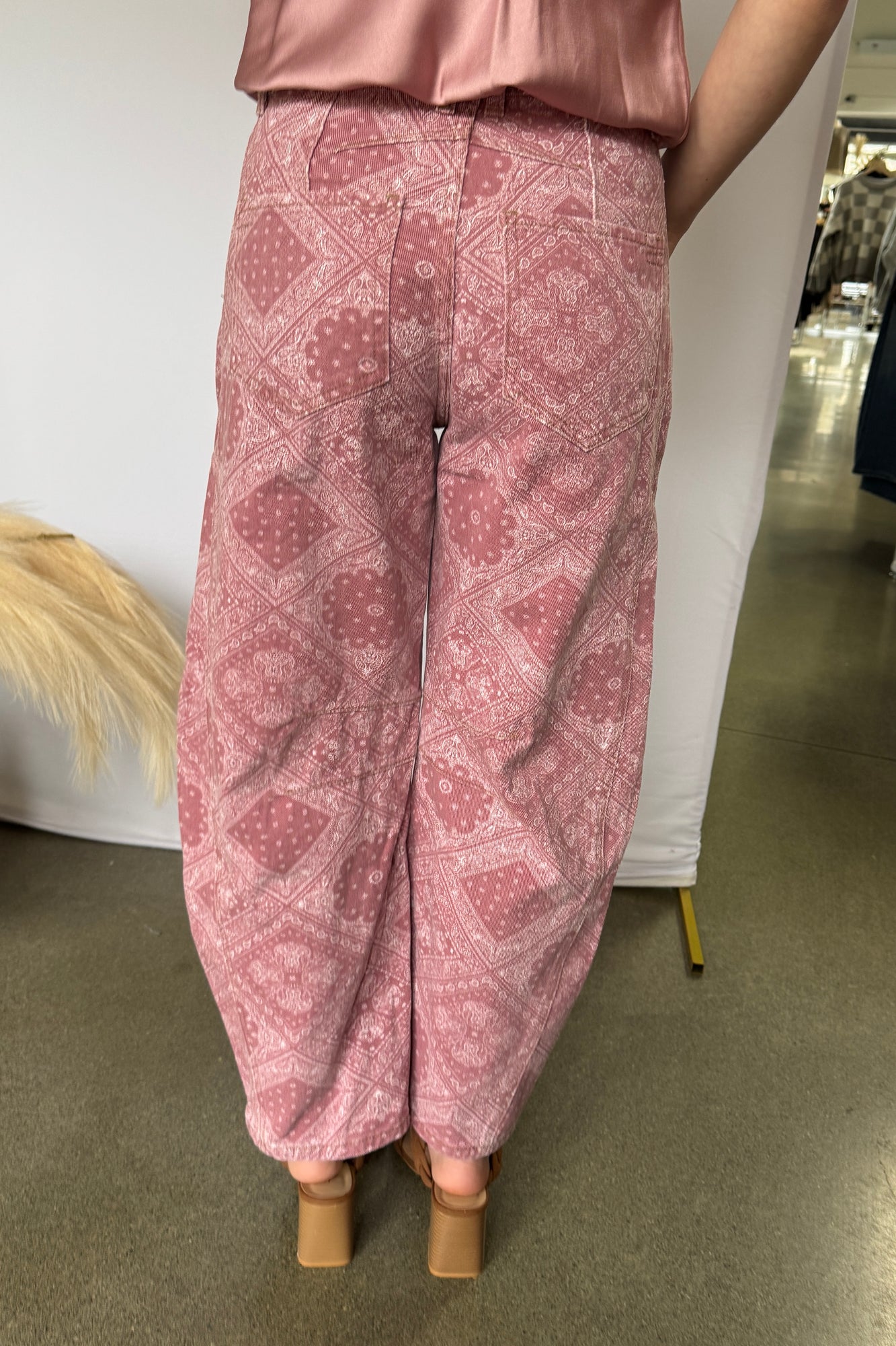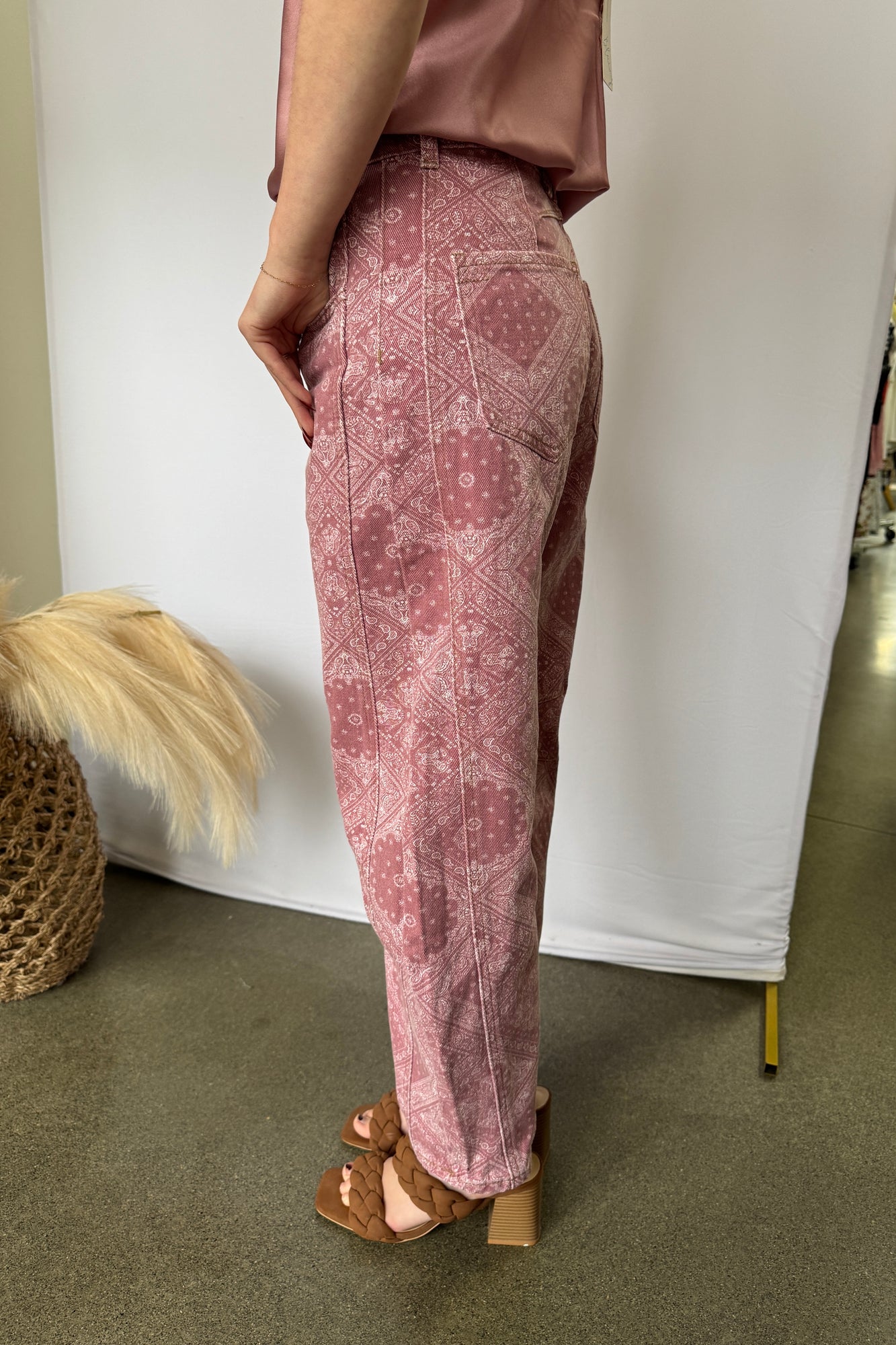 Paisley Printed Denim Pants Make a statement with these eye-catching denim pants featuring an all-over paisley print in soft pink. The relaxed barrel leg silhouette offers a modern, comfortable fit that works for casual outings or dressed-up occasions. Crafted from quality denim, these pants blend timeless style with contemporary flair. Perfect for adding personality to your everyday wardrobe while keeping comfort front and center.