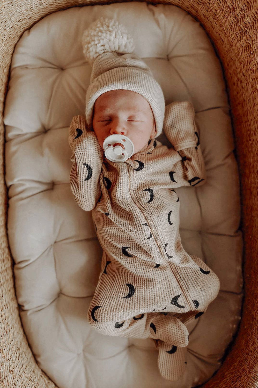 Organic Waffle 2-Way Zip Footie, Tan/Black Moon