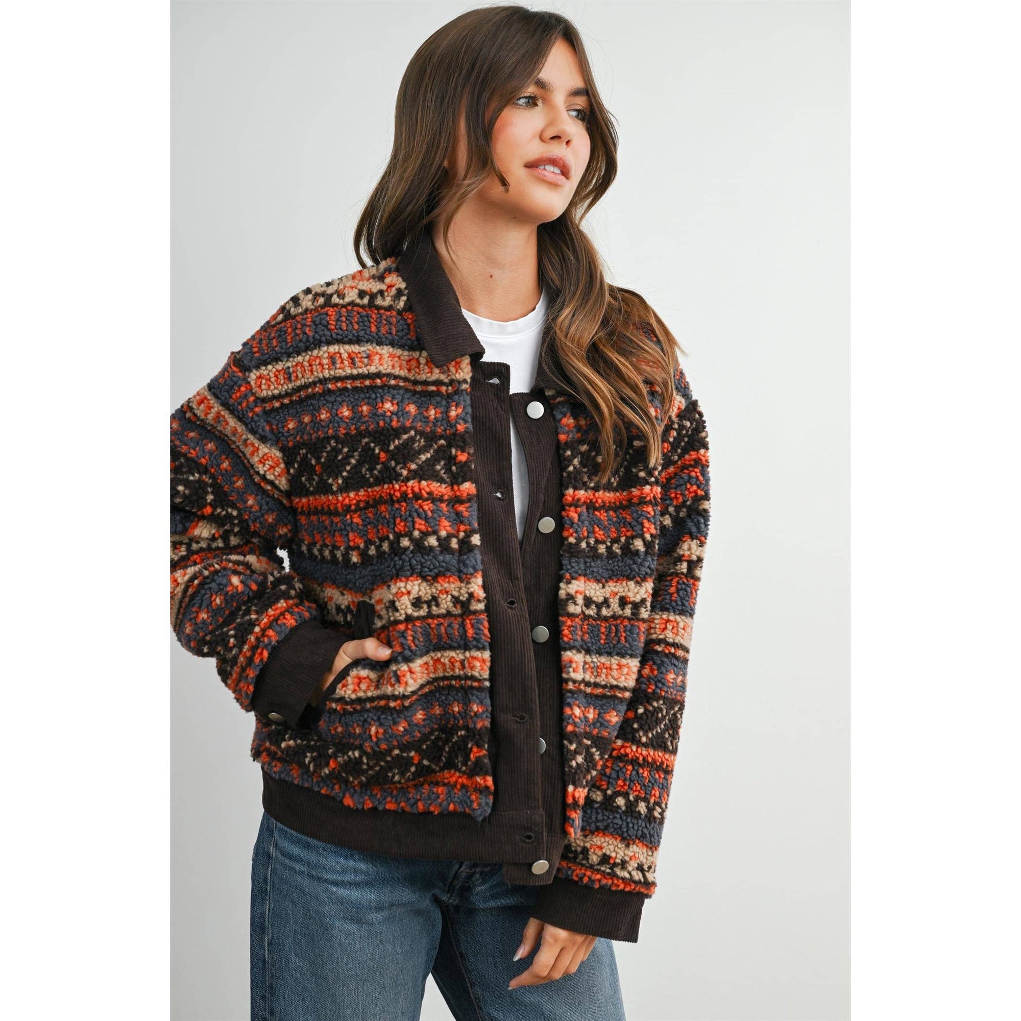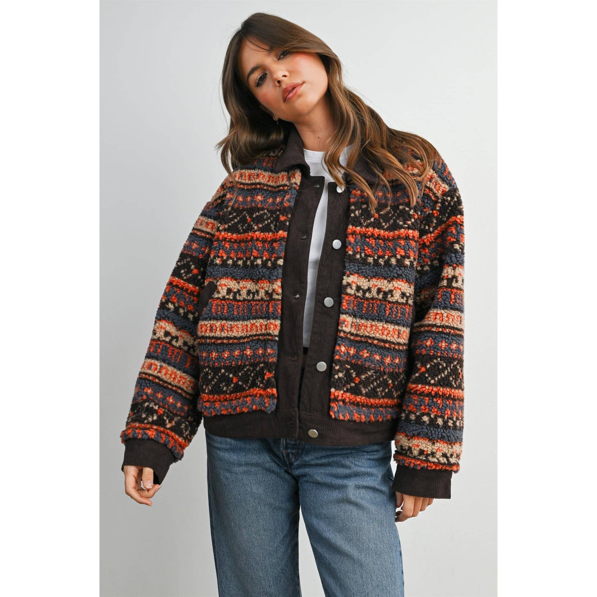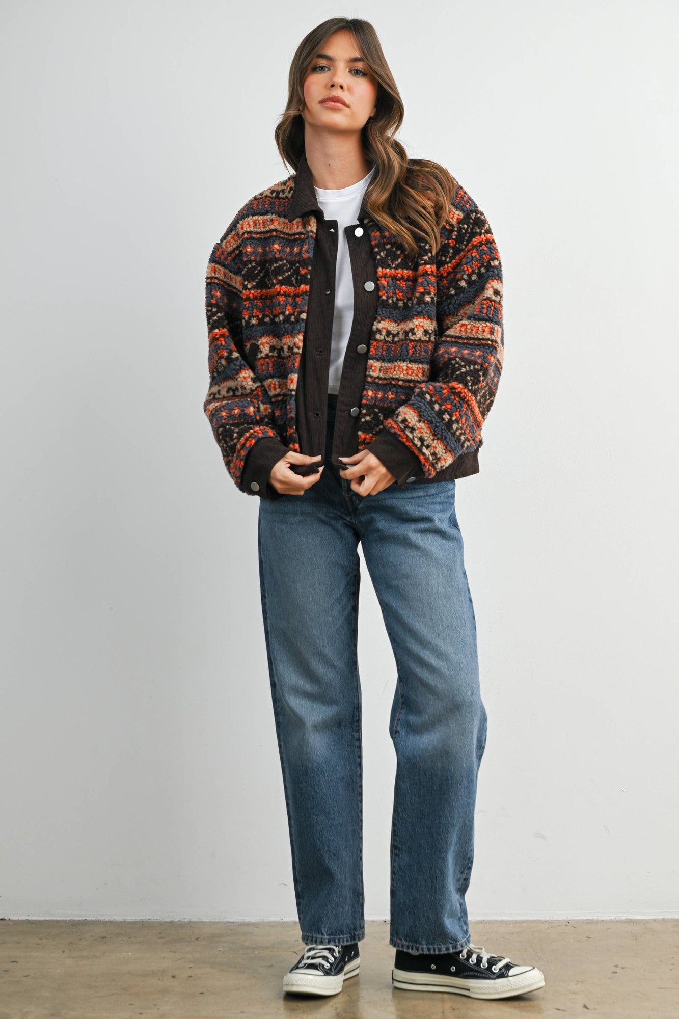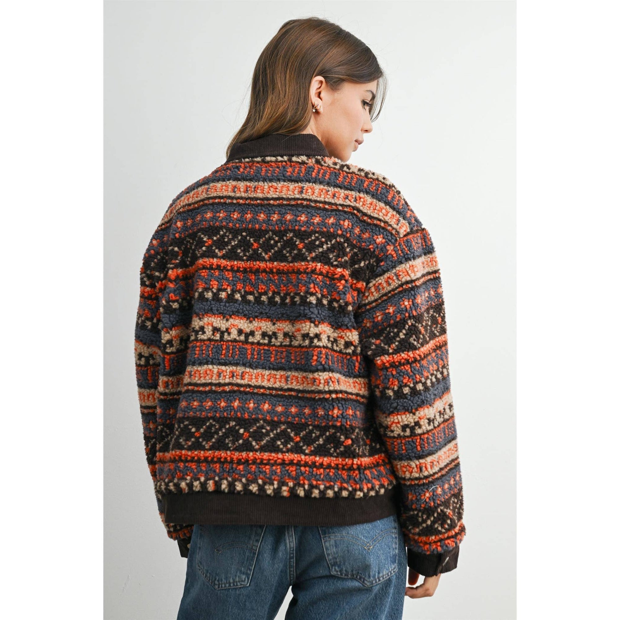 The Patterned Button-Front Fleece Jacket is the perfect mix of cozy comfort and standout style. Made from soft fleece, it provides warmth while keeping you stylish on chilly days. The button-front closure adds a classic touch, while the eye-catching patterned design brings a modern edge. Versatile and easy to layer, this jacket is ideal for casual outings, outdoor adventures, or simply staying snug in style.