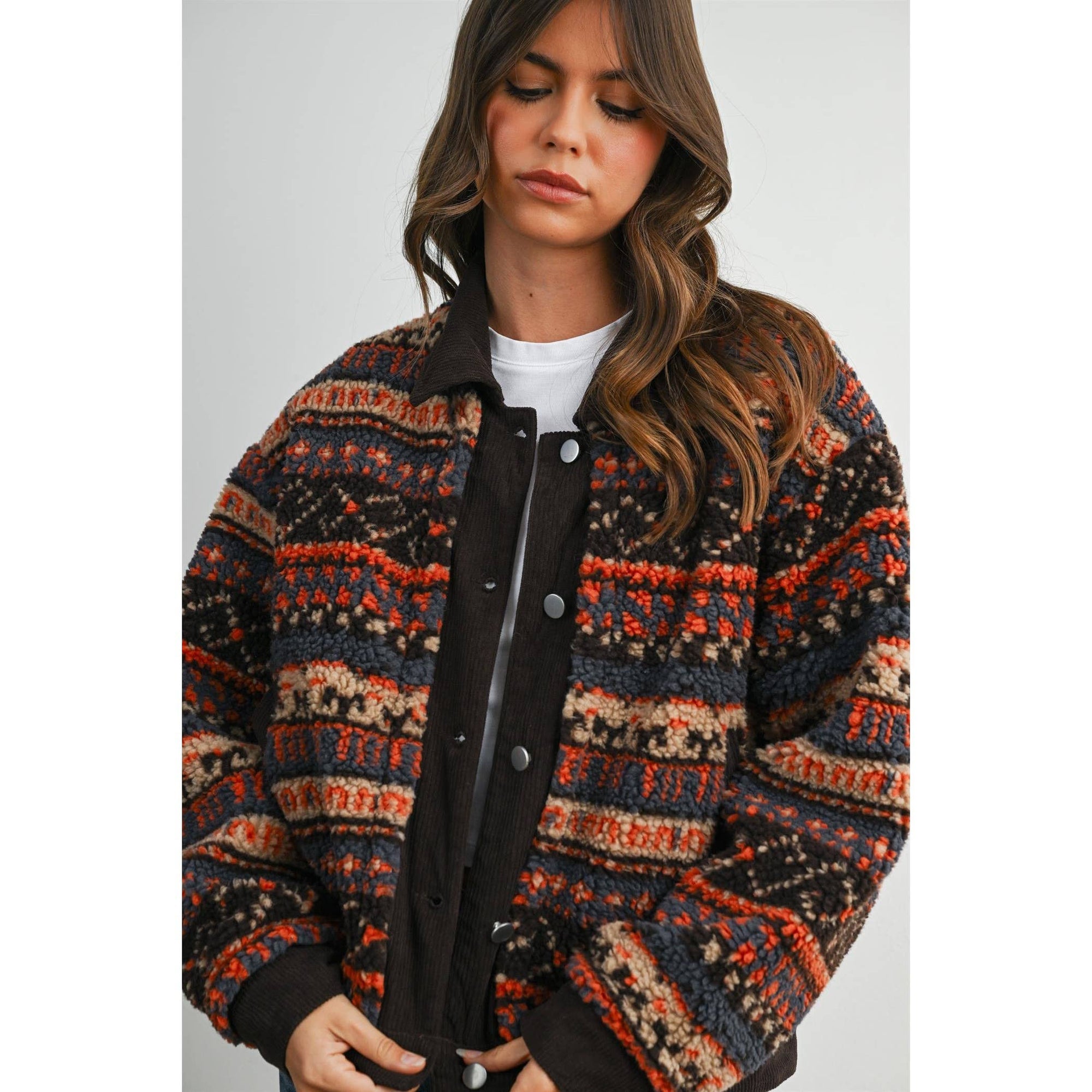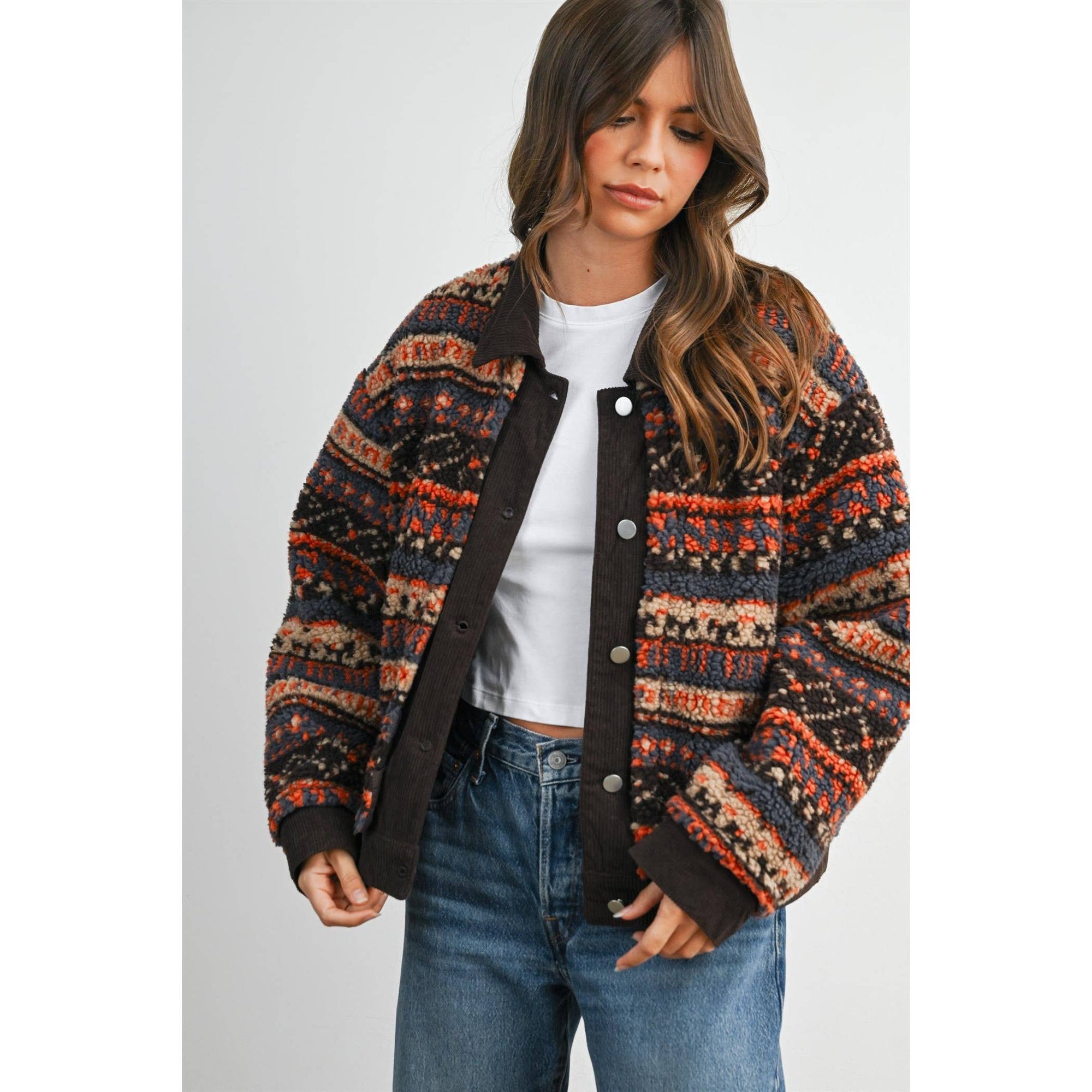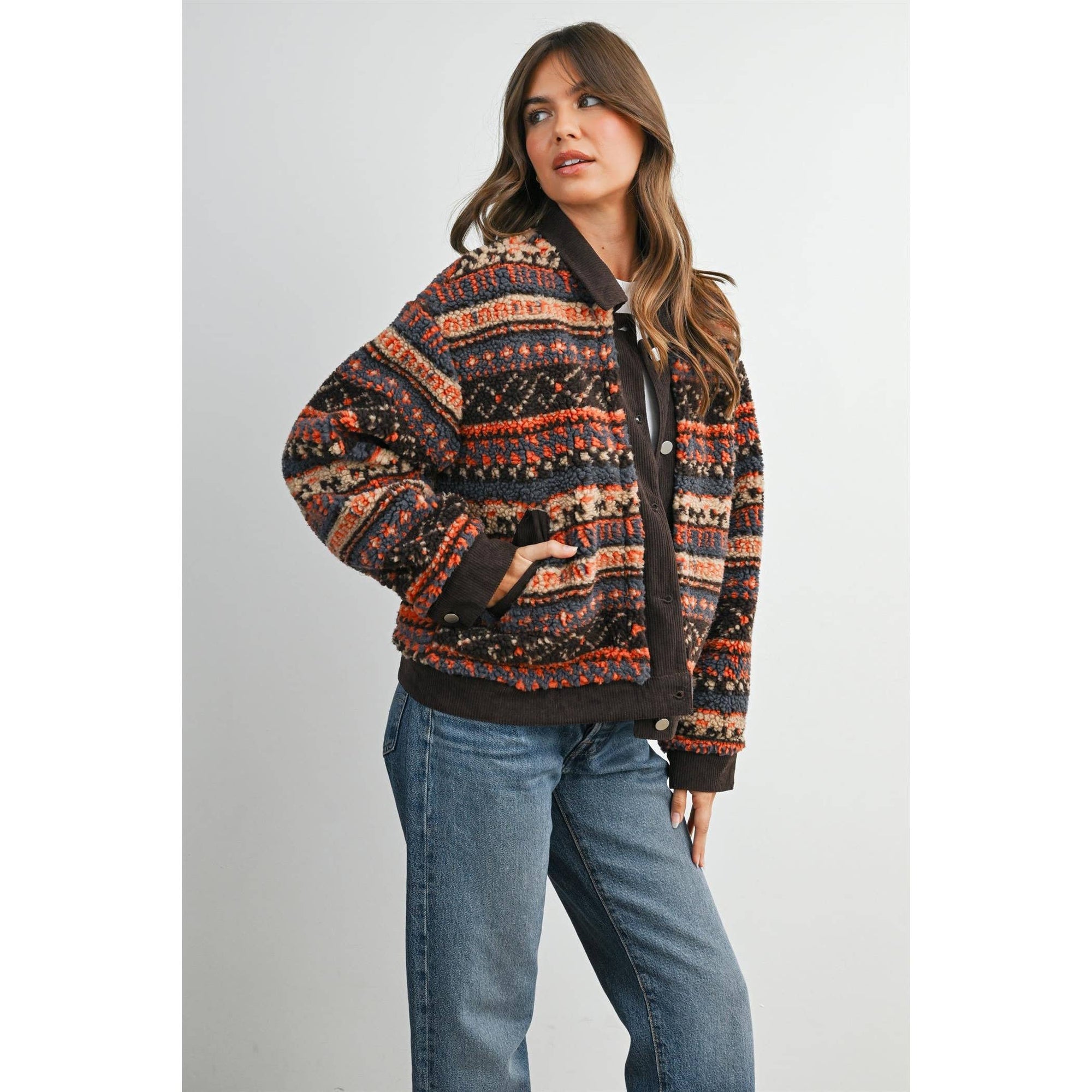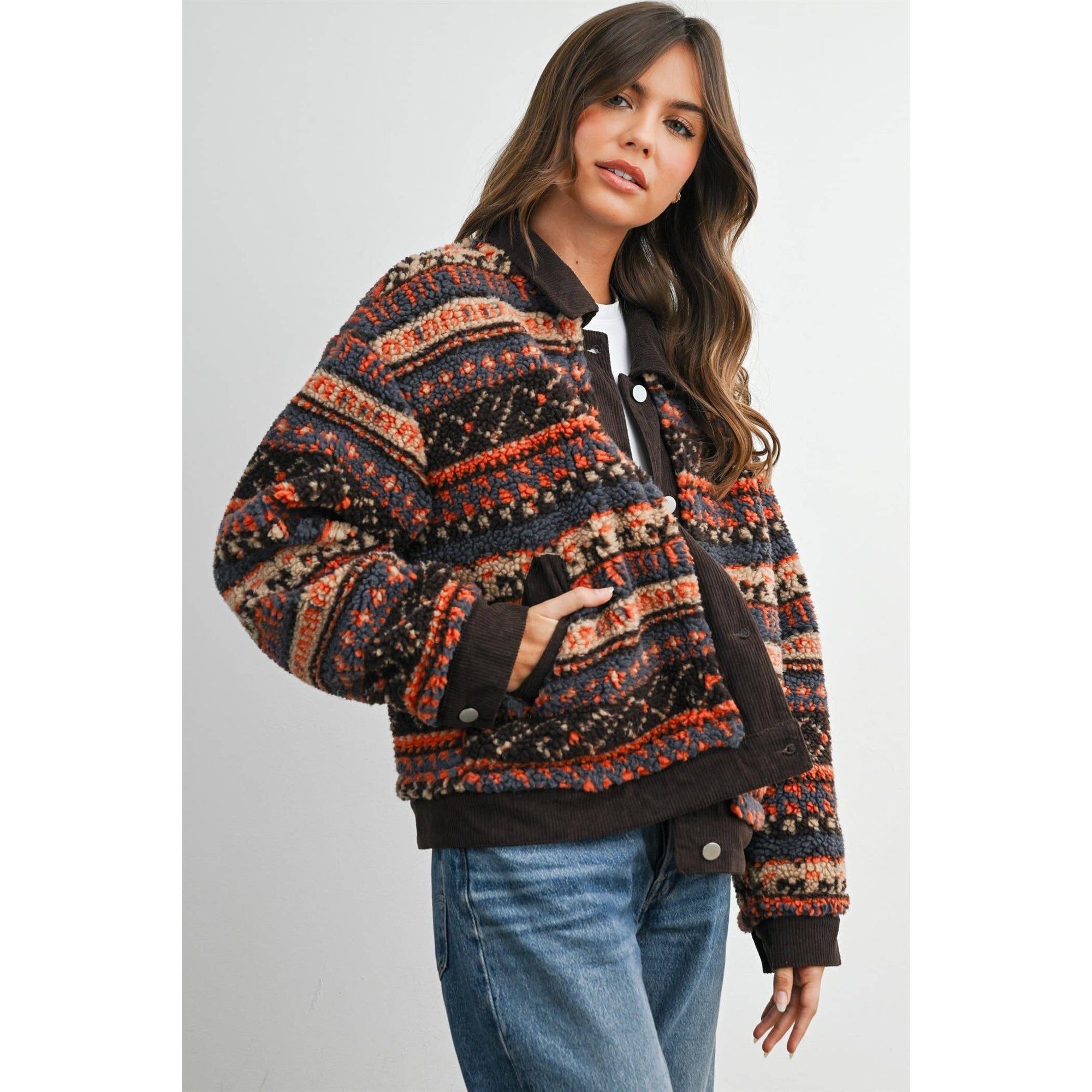 The Patterned Button-Front Fleece Jacket is the perfect mix of cozy comfort and standout style. Made from soft fleece, it provides warmth while keeping you stylish on chilly days. The button-front closure adds a classic touch, while the eye-catching patterned design brings a modern edge. Versatile and easy to layer, this jacket is ideal for casual outings, outdoor adventures, or simply staying snug in style.