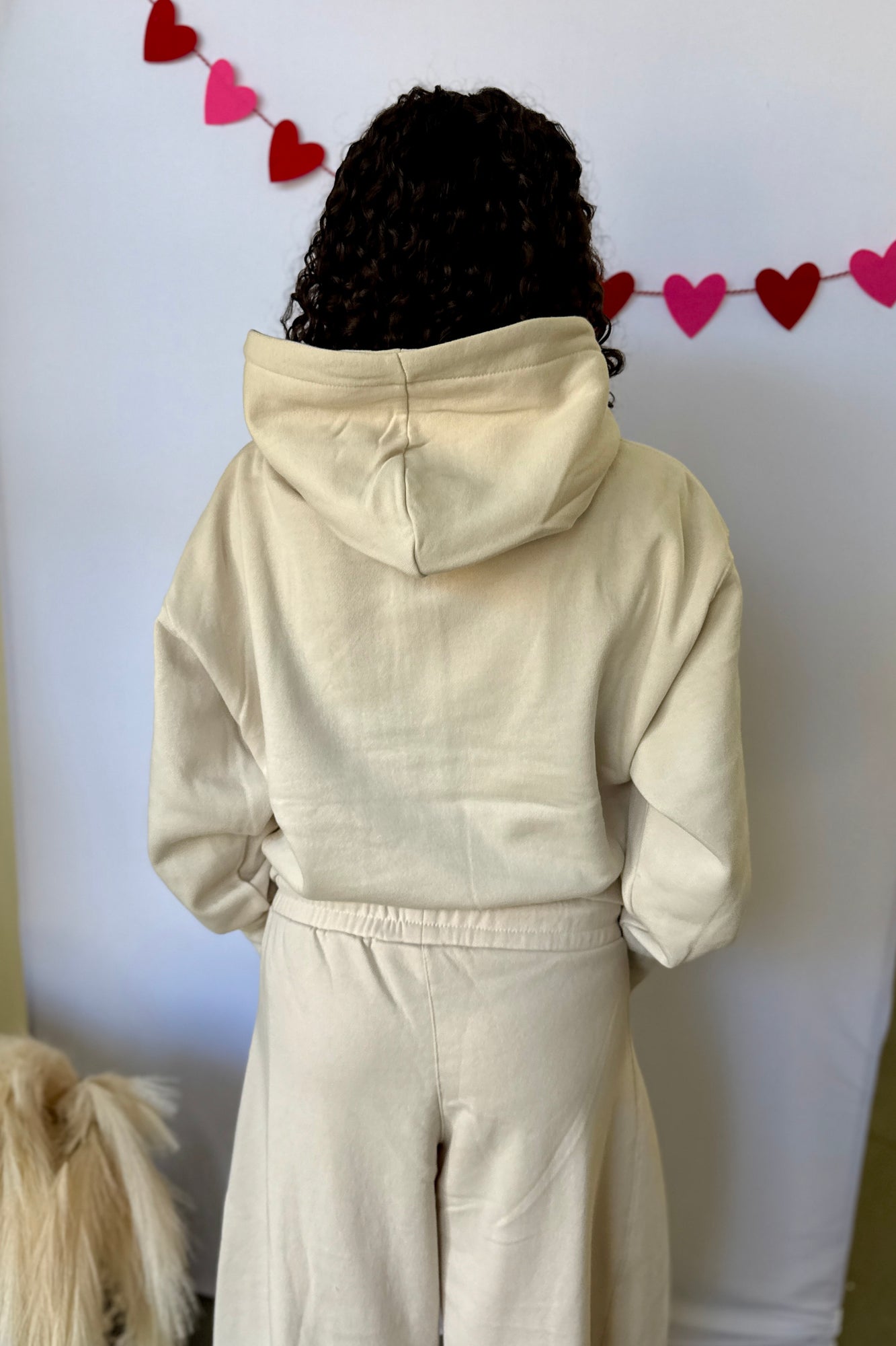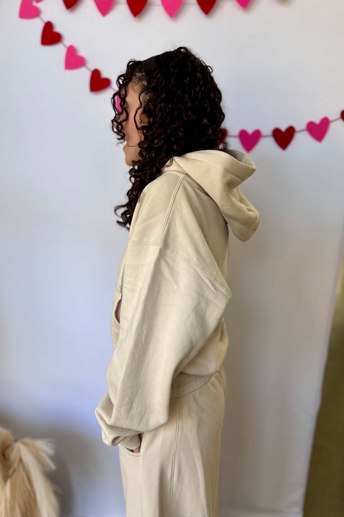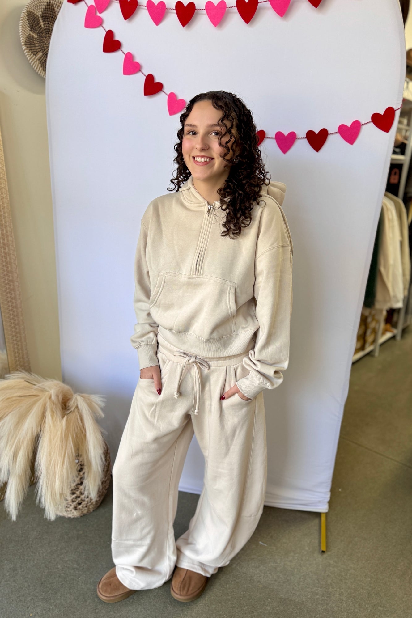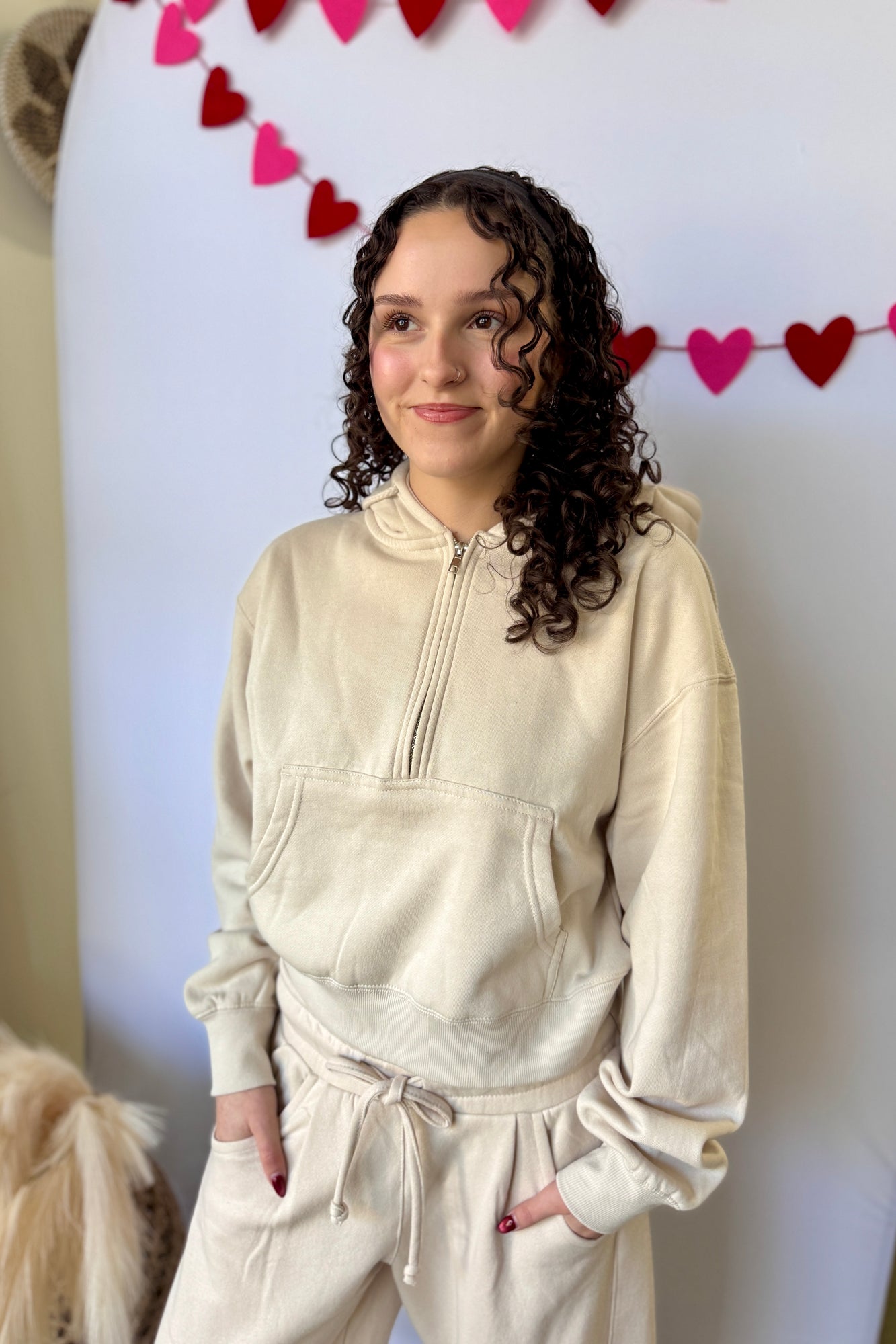 Introducing our Fleece Half Zip Hoodie in Cream. This cute lounge top is perfect for chilly days. With its half-zip design, it's easy to slip on and off, while the soft fleece material will keep you warm and cozy. Stay stylish and comfortable in our Fleece Half Zip Hoodie.