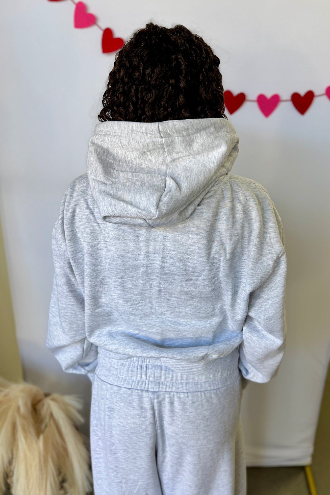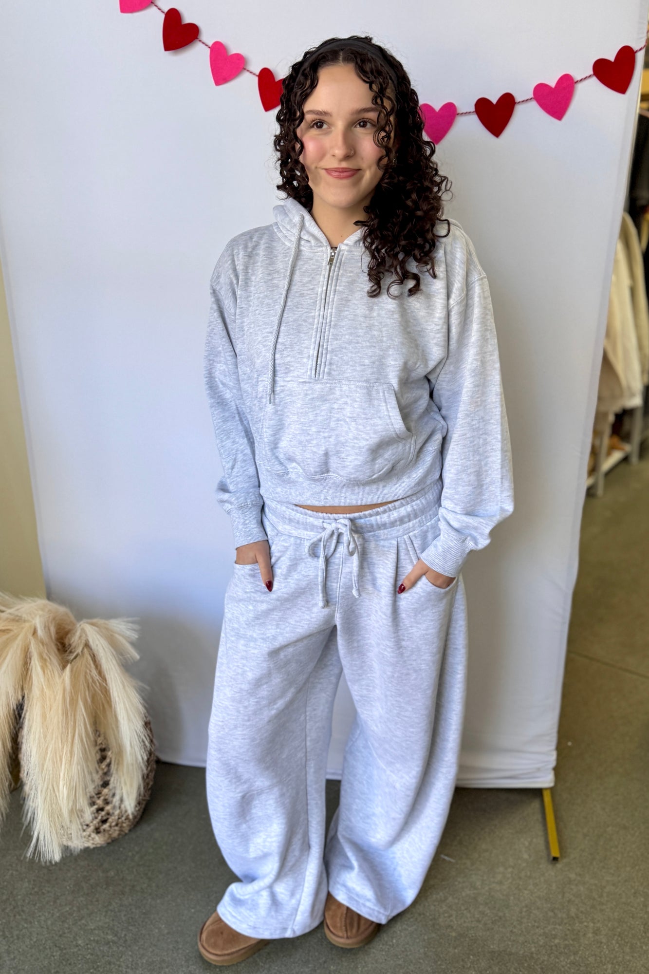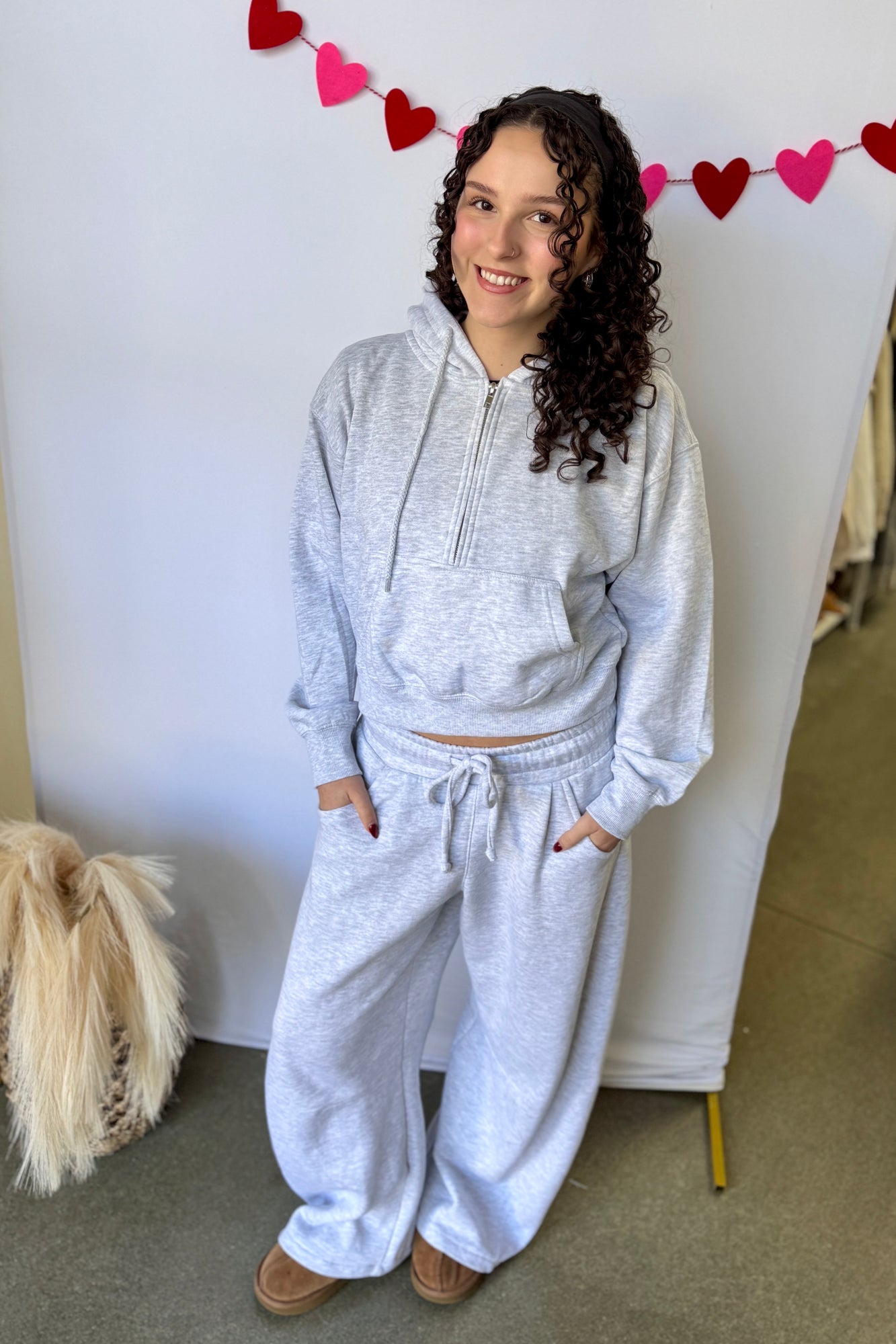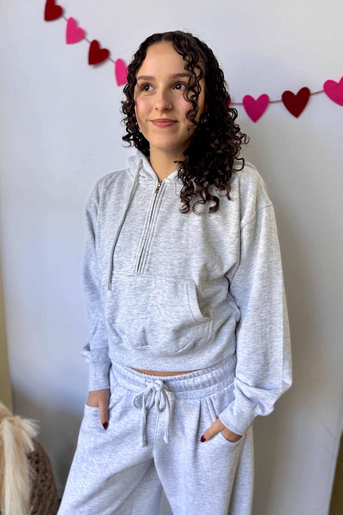 Introducing our Fleece Half Zip Hoodie in Grey. This cute lounge top is perfect for chilly days. With its half-zip design, it's easy to slip on and off, while the soft fleece material will keep you warm and cozy. Stay stylish and comfortable in our Fleece Half Zip Hoodie.