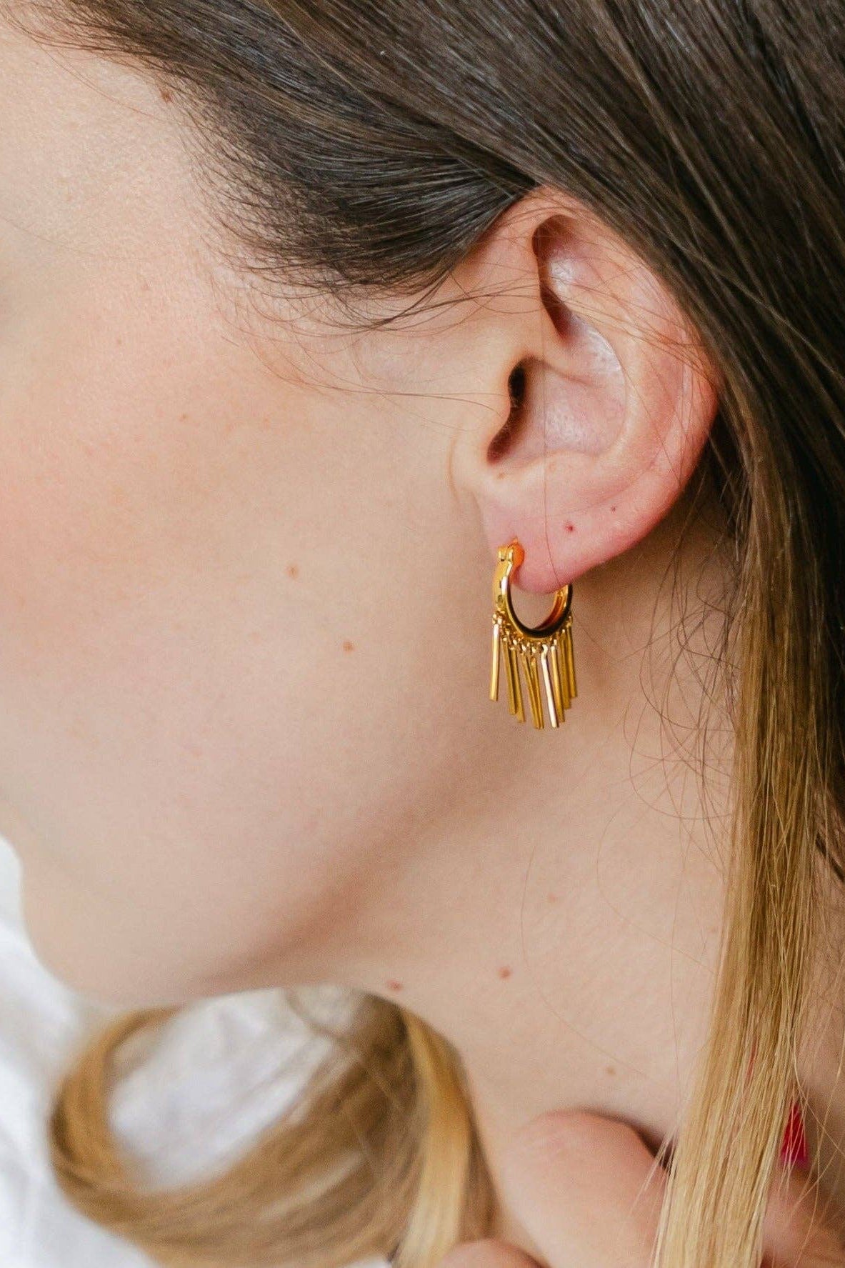 Our Fringe (With Benefits) Hoops have strings attached - in the best way possible. These polished mini hoops feature delicate fringe-like drops that move with you, catching the light and adding a touch of shimmer with every step. Equal parts fun and refined, they’re perfect for when you want something a little extra without going over the top.